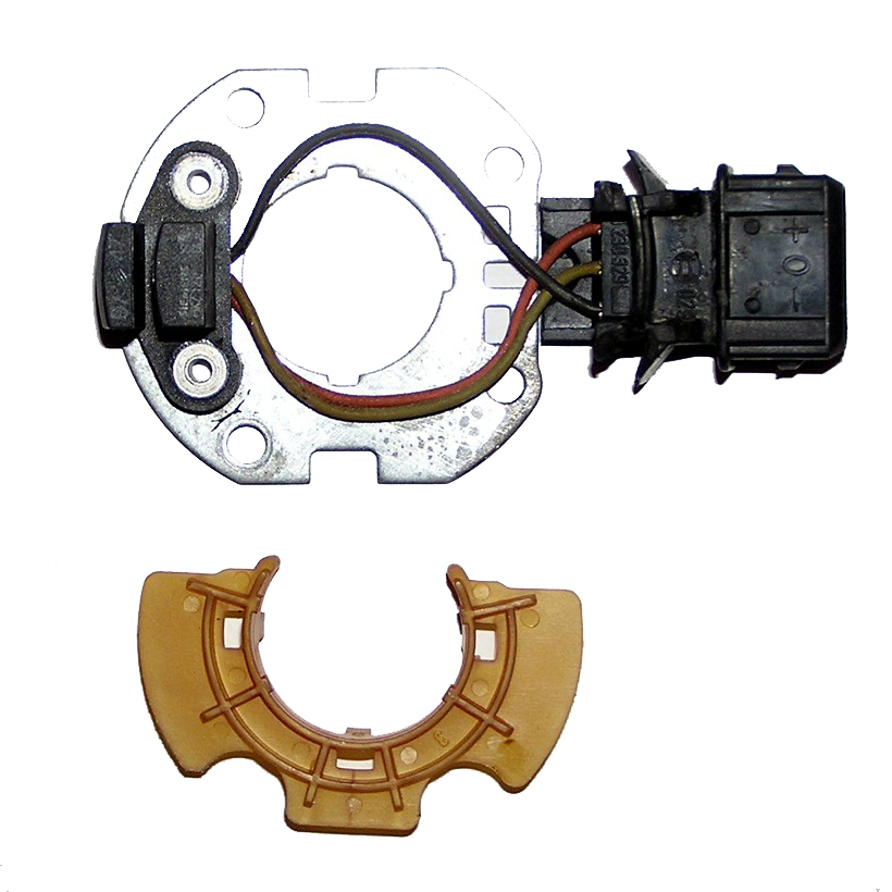 With the serrated washer in place, reinstall the distributor as you disassembled it. If you tear any of the fiberboard washers during reassembly, make yourself new ones using paper gasket material. Cut them out, oil them and install them. Do not assemble the distributor without the fiberboard washers as these serve to hold lubrication for the sliding washers. Camshaft Position Sensor If your camshaft position sensor has failed and you've ruled out oil contamination and poor grounding as the cluprit, the sensor should be replaced. That being said, I have been unable to source a replacement sensor. No worries, however, as you can rebuild the sensor yourself. Here is the sensor, with it's protective plate sat aside: