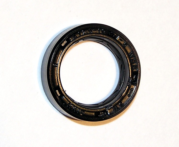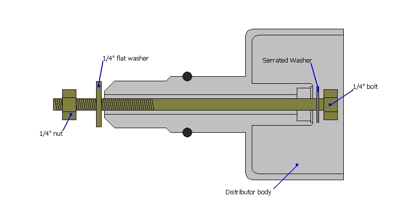 The original oil seal is a spring seal made by SIKU and has the following dimensions: 12.5 mm ID, 19 mm OD and 5mm thickness. As removed, my seal had hardened to the point that I couldn't flex it with my fingernail; this hardening appears to be the cause for oil leakage. Sourcing a replacement seal is nearly impossible; both SKF and KOK specify a 12.5x19x5 oil seal, however, I haven't been able to provide a supplier for either. After a substantial search, I did find a seal that should work: Boca Bearings sells a 12mm x 19mm x 5mm oil seal for under $7. The ID of this replacement seal is smaller, however, only 0.25mm in radius; this shouldn't present a problem and may even help provide a seal if your shaft is substantially worn. NOTE: The oil seal in our Bosch distributor is the same seal used in the distributor of the MK2 Volkswagen Golf and Jetta; if the above supplier becomes unavailable, you may be able to source a replacement seal that is specified for the Volkswagen distributor. Other seals that fit are: NAPA part number 4912, SKF #4702, and Honda #91206-KV3-003. Once you have the replacement seal, you'll want to press it into place and then reinstall the serrated washer. I tried tapping the serrated washer into the distributor body using a small peen and cracked the aluminum body; I'd recommend against doing this. Instead, use a bolt and nut to press-in the serrated washer as illustrated: